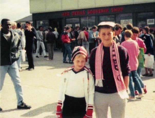 Robson celebrated 10 years at the United with a testimonial against Celtic in November 1990. I managed to sneak out of school early to get the mini-bus up to Manchester from Northampton; my Chipie jumper hanging loose over 25-inch bell bottom jeans. It was a glorious time to be a 16 year old. What wasn’t quite as glorious was my haircut above. Full Clint Boon and my bro wearing a United dress.